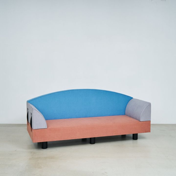 「内⽥繁さんがデザインしたこのソファは、福岡のホテル『イル・パラッツォ』のスイートルームのために作られたものです。“HOT MADISON”のファブリックを使ったマルチカラーが印象的で、事務所で当時の写真を⾒せていただいた時にとても惹かれました。もともとは⼀般流通していた家具ではありませんが、図⾯が残っていたことから再製作が可能になり、『Graphpaper TOKYO』でも取り扱いを⾏っています。ホテルのために⽣まれた家具ならではの存在感があり、個⼈的にも思い⼊れのあるプロダクトです」