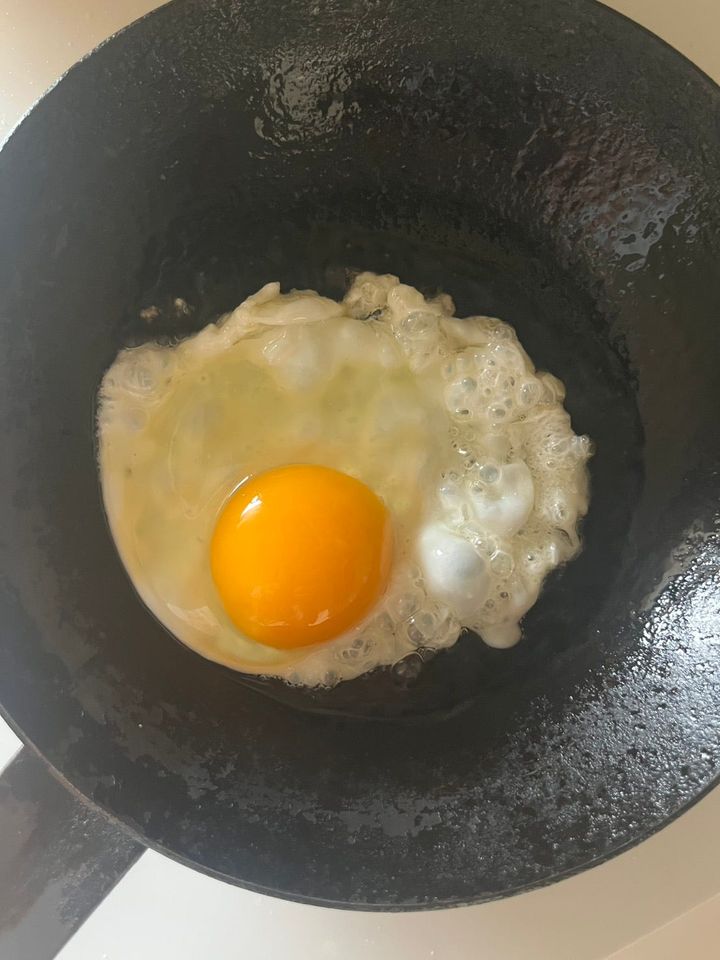 「『釜浅商店』の鉄のフライパン(18cm)を愛用しています。『eatrip』の名前を彫っていただいたこともあるほど、長く使い続けている道具です。『eatrip soil』でもお取り扱いしています。鉄のフライパンは、使い込むほどに油がなじみ、どんどん使いやすくなっていきます。その変化も含めて、自然と愛着が湧いていくところが魅力です。朝は目玉焼きを焼きながら、横でハムやトマト、ブロッコリーなどを一緒に焼いたり、トーストやお餅を焼くこともあります。卵5個分のオムレツも、このフライパンで作ります。また、手持ちの別の鍋の蓋を合わせて、軽く蒸し煮のように使うこともあります。サイズが小ぶりで重すぎず、持ち手が長めなので扱いやすく、ガスでもIHでも使えるところも気に入っています」
