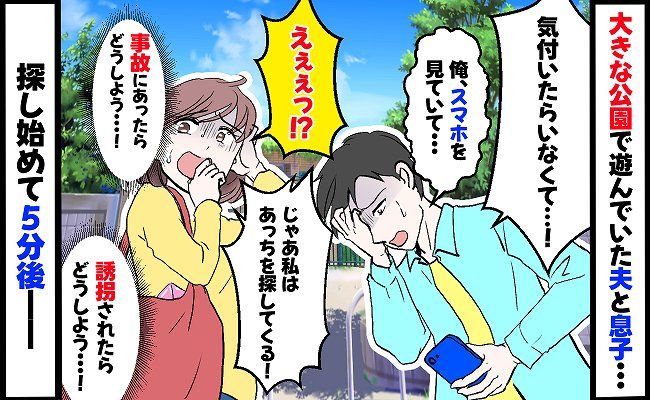 息子が3歳のころ、家族で大きい公園に遊びに行ったときの話です。途中、夫に息子をみてもらって、私は買い物に行きました。そして買い物から帰ると、なんと夫が「スマホを見ていたら息子がいなくなった!」と慌てていたのです。私は血の気が引いていくのを感じました……。