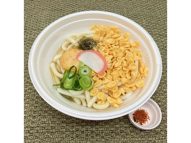 さつま揚げ・あげ玉・とろろ昆布・ねぎ・蒲鉾を盛り付けたシンプルな味わいのかけうどんです。 宮崎・鹿児島で販売