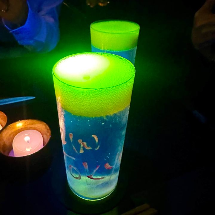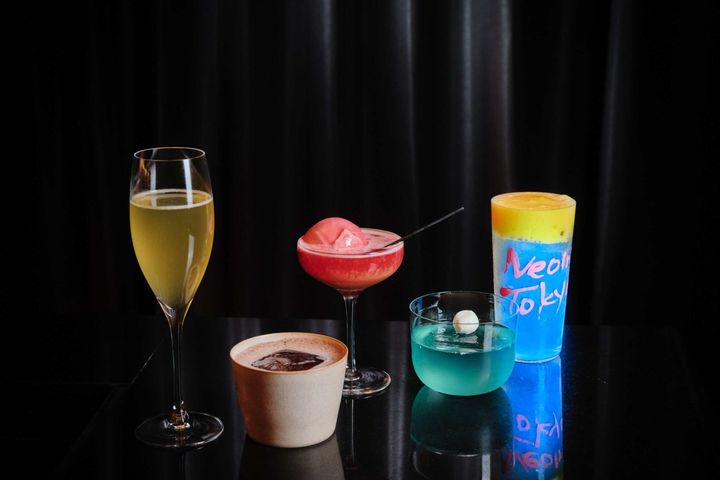 メニューにブラックライトを照らすと、暗闇の中にカクテル名とアートが浮かび上がり、幻想的な世界へと誘います。遊び心たっぷりの「ネオ(ン)東京スリング」は、照らすとネオン色に発光する仕掛けが♪