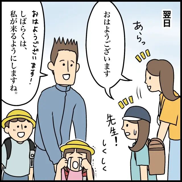 そして翌日。今日も班長さんである娘ちゃんと一緒に集合場所にやって来たお母さんは、そこに先生がいるのに気づきました。「おはようございます」挨拶すると、「おはようございます!しばらくは、私が来るようにしますね」すでに泣いている女の子に付き添いながら先生がそう言ってくれました。