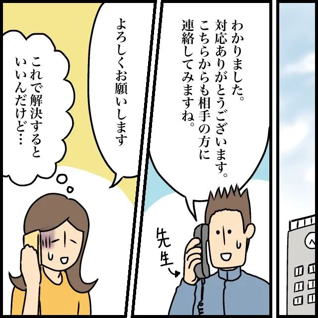 「わかりました。対応ありがとうございます。こちらからも相手の方に連絡してみますね」先生がそう言ってくれ、「よろしくお願いします」と話して電話を切った後、「これで解決するといいんだけど・・」と心の中で呟きました。