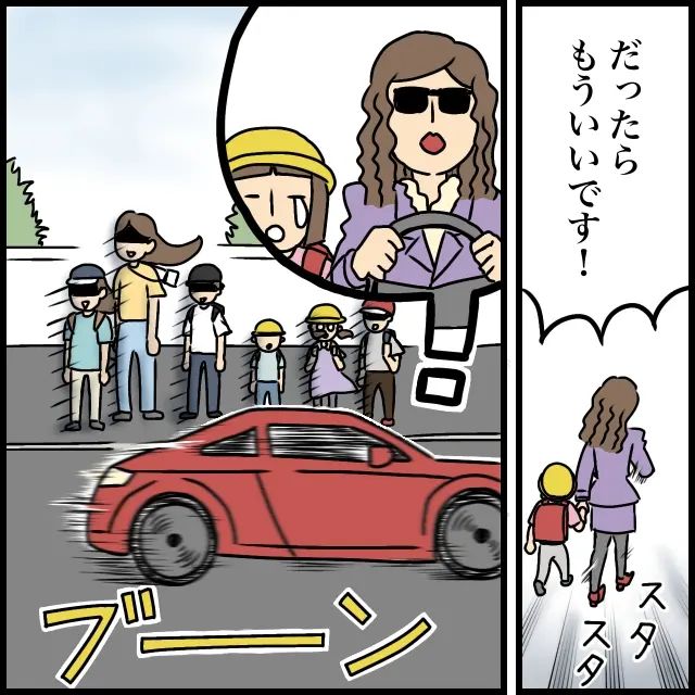 「だったらもういいです!」そう言い捨てると娘ちゃんと一緒にスタスタ歩いて行ってしまい、少しすると赤いスポーツカーを走らせて班のみんなの横をブーンと走り去って行きました。