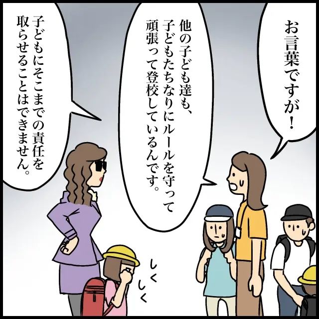 「お言葉ですが!他の子ども達も、子どもたちなりにルールを守って頑張って登校しているんです。子どもにそこまでの責任を取らせることはできません」班長さんのお母さんがそう言うと、