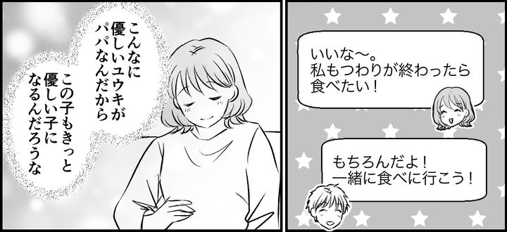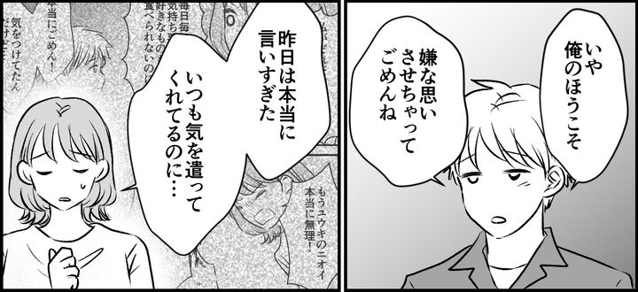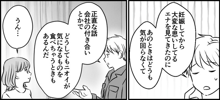 私はエナ。ニオイづわりが原因で、夫ユウキを家から追い出すかたちになってしまいました。すると母から「甘えすぎ」と注意されたのです。反発した私でしたが、母から「ユウキくんだって我慢している」と指摘されてハッとしました。そういえばユウキは、毎日つわりの私向けのあっさりした食事を用意してくれるうえに、文句ひとつ言わず一緒に食べてくれています……。私は怒りのあまり、ユウキが自分の好きなものを我慢してくれていることを忘れてしまっていたのです。自分の身勝手さを痛感し、心から謝ろうと決めました。