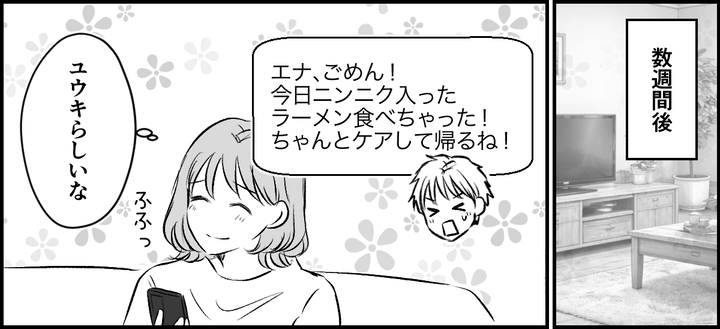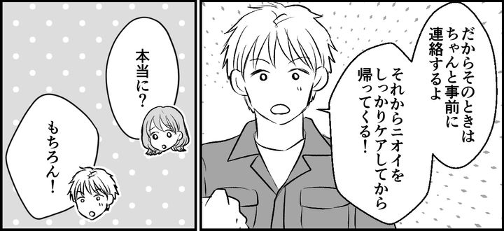 ユウキは今後、会社の付き合いでニオイの強いものを食べた際には、必ず事前に連絡して徹底したニオイケアをして帰宅すると約束してくれました。