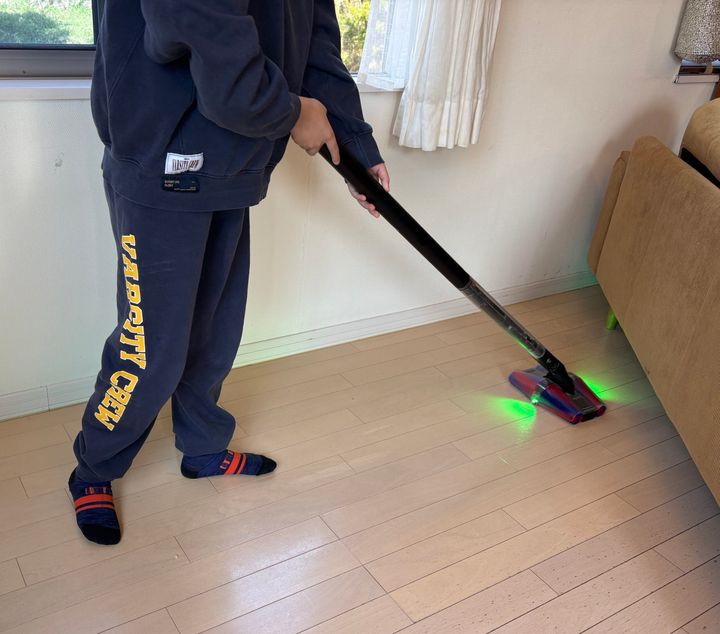 おすすめしたいのが、ダイソンの『Dyson PencilVac Fluffycones』。驚くほどスリムなのに、大きなゴミから微細なホコリまでパワフルに吸い取ってくれるんです。最大の特徴は、自由自在にスライドするヘッドと、目に見えないホコリを可視化するLED。入り組んだ家具の間や低い隙間も、スイスイきれいになります!