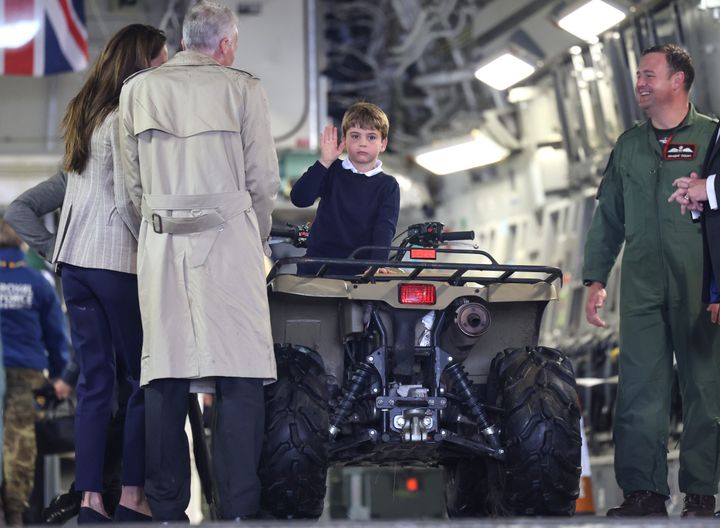 ウィリアム皇太子にかまってほしかったのか、軍服のエギュイエット(金色のロープ)を引っ張ってしまう場面も。まだまだ甘えたいお年頃のようだ。