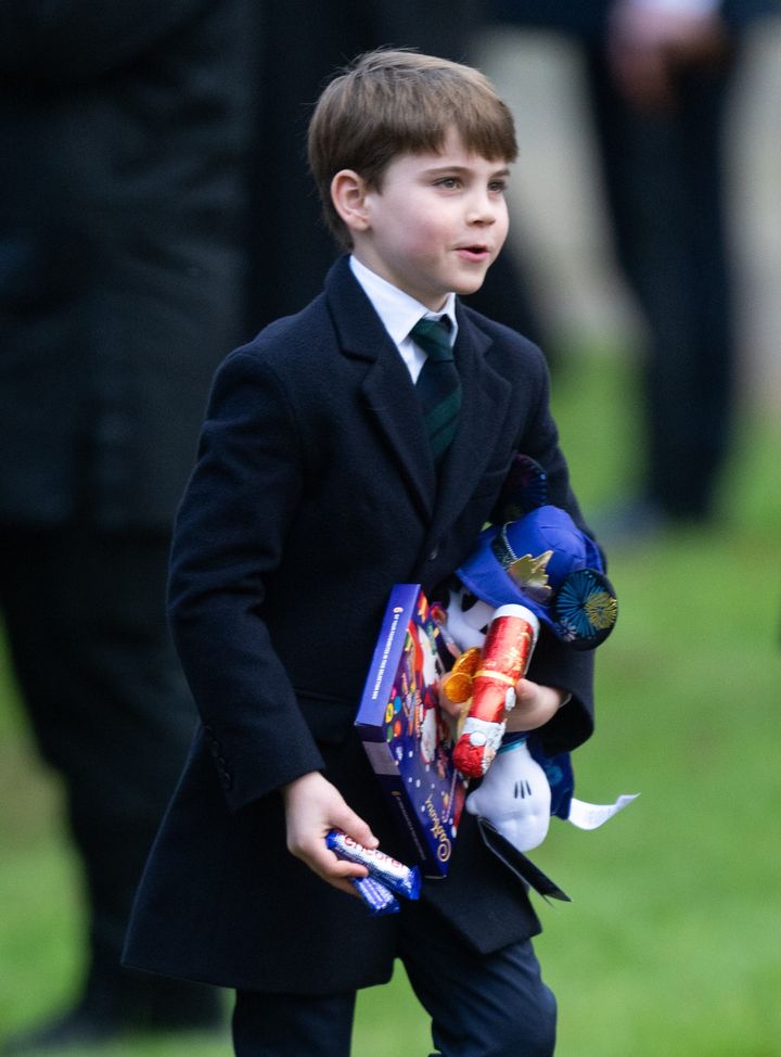 毎年恒例のクリスマス礼拝にて。大きなクマのぬいぐるみほか、ファンからたくさんのプレゼントをもらって満足気なルイ王子。