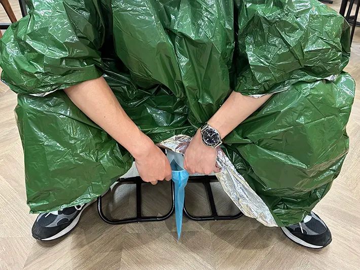 最後にポンチョをかぶって、排せつの体勢を整えます。