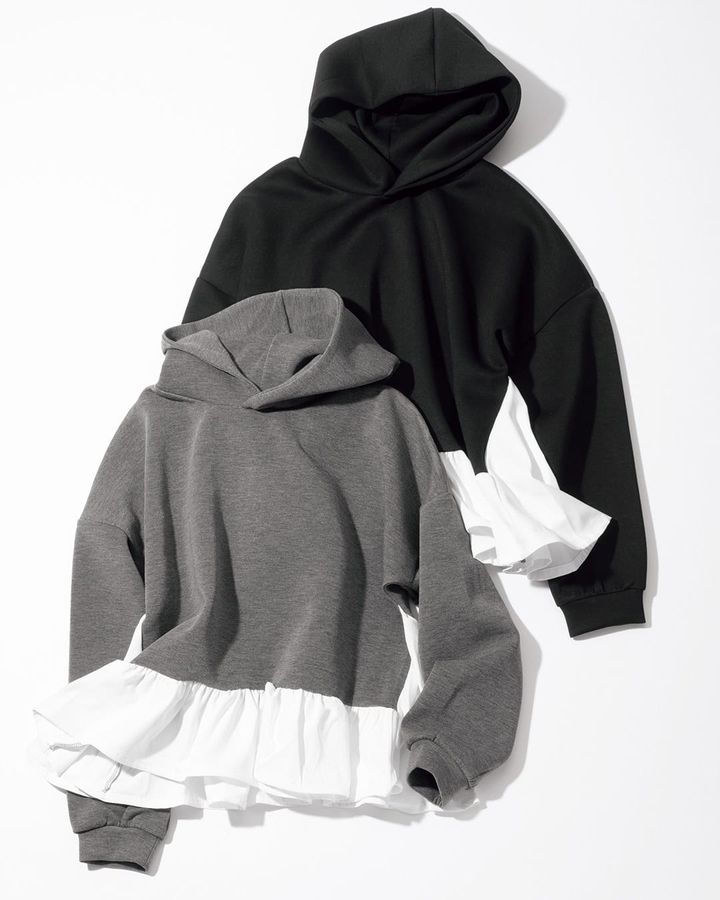 サイドにスリットが入り、実際にシャツをレイヤードしているように見える華やかパーカ。上品見えする薄手のポンチ素材はカジュアルになりすぎず、コンサバ派も満足の1枚。