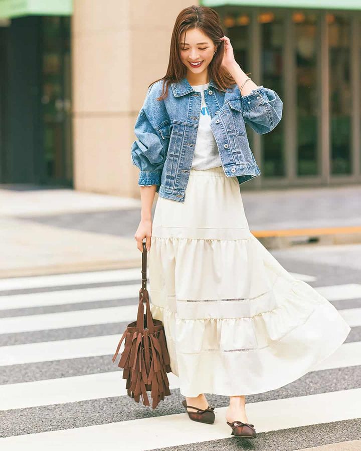 スカート¥13,750(スパン)ジャケット¥26,400(アルページュ/アルページュストーリー プレスルーム)Tシャツ¥12,100(カデュネ/カデュネ プレスルーム)バッグ¥14,300(アドカラム/アンソロジー)パンプス¥12,100(ル タロン/ル タロン 有楽町マルイ店)ピアス¥3,900(soie/ロードス)バングル¥22,000(ワンエーアールバイウノアエレ/ウノアエレ ジャパン