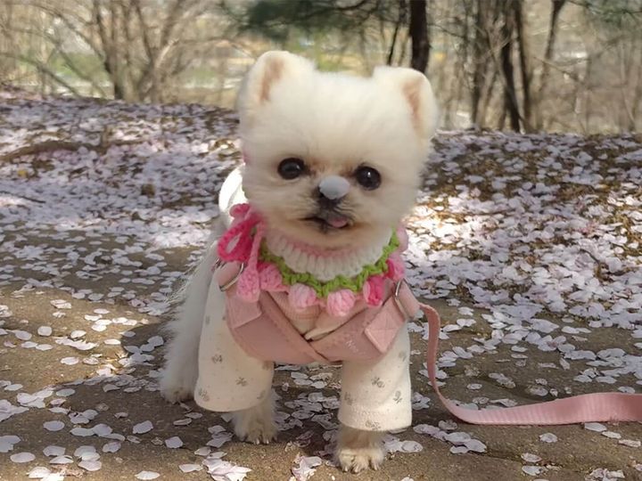 3. お花見に来たポメラニアンさん、桜の花びらが気になって仕方ない!