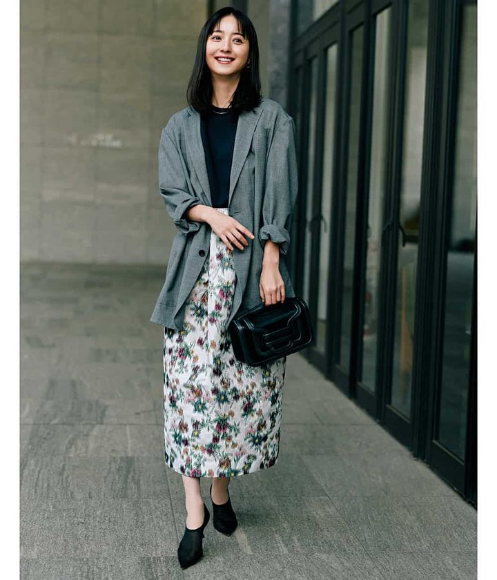 育児に奮闘する佐々木希さんが、「ママOFF」のお仕事服に選びたいアイテムは?それは、凛としていて背筋が伸びる+カッコ良さすら纏える「新鮮な花柄」。オシャレ心を掻き立てられ、お仕事にも使えるきちんと感で、シンプル服をブラッシュUP。知的な華やかさを纏って。