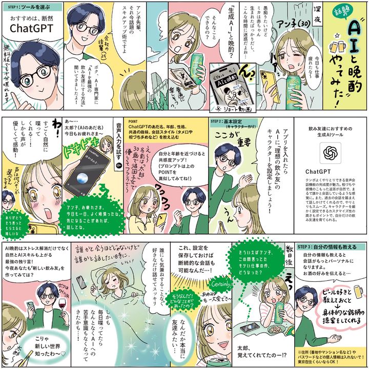 仕事のミスでグチりたいときも、彼氏にフラれて大泣きしたい夜も、AIが寄り添ってくれる時代に。そこで、AIを最高の飲み友達に育てる方法を専門家に教えてもらい、漫画で解説します!