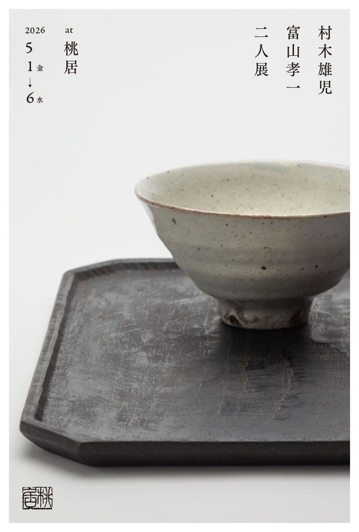 「村木さんと富山さんは、扱う素材は違えど、工芸に対する熱い思いは変わりません。村木さんの薪窯の窯焚きには毎回のように富山さんが通い、富山さんが工房に併設するギャラリーでは、村木さんは何度となく展示をされています。信頼し合うおふたりですが、二人展は初めてです。がっぷりとよつに組んだ、チカラのこもった展示が楽しみです」(桃居 店主)