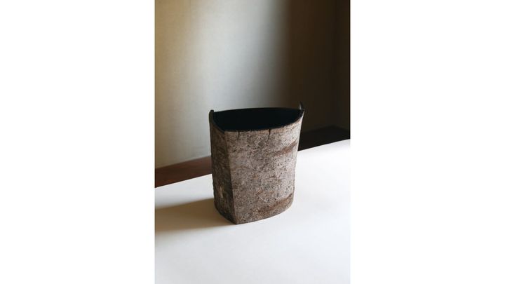 「写真の作品は欅の木肌を巻き取って制作したワインクーラーです。自然が作り出した、木の造形を大切にしながら、技術力と感性で作り出したお盆や箱、平面作品をご紹介いたします。この機会に、木に触れる心地良さを感じていただきたいと思います」(日々 店主)