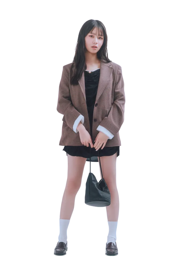チェックジャケット 16,000円/mieya mieya ギャ ザーミニワンピース 9,900円/PELLICULE バッグ 30,030円/minitmute(HANA SHOWROOM)ローファー 34,100円/G.H.Bass(フリークスストア渋谷)ソックス/スタイリスト私物