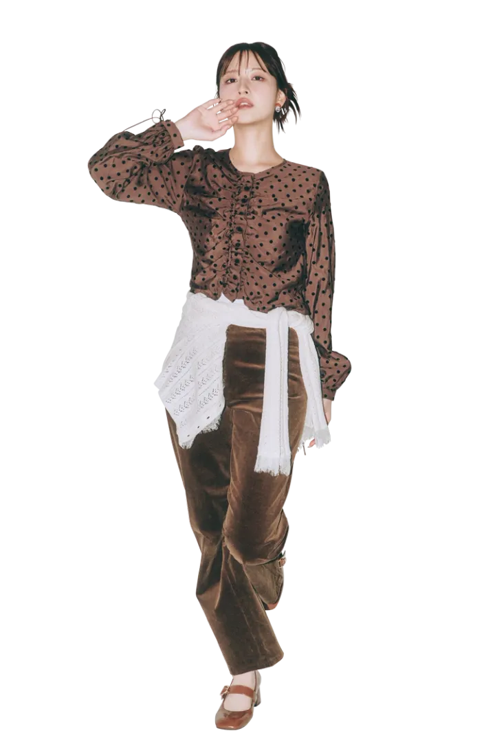 センターギャザーブラウス 13,200円/レイ ビームス(レイ ビームス 新宿)コーデュロイパンツ 15,340円/TANNAT(HANA SHOWROOM)腰に巻いたカーディガン(キャミソールとセット)17,930円/LILY BROWN イヤリング 3,410円/Linola(805showroom)パンプス 9,900円/RANDA
