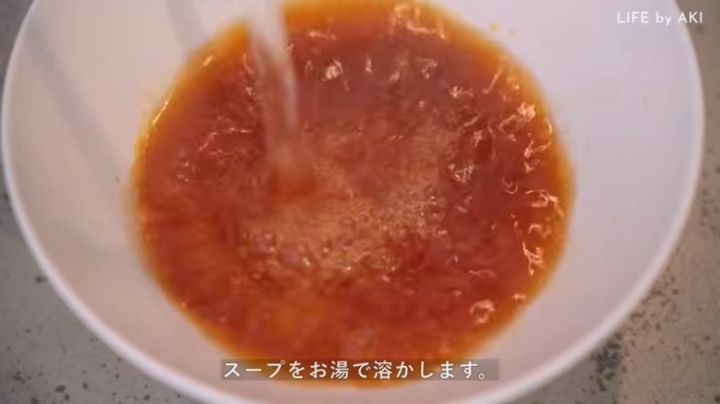 スープの素は器にいれてお湯で溶かすだけ。茹で上がった麺を入れたら完成です。