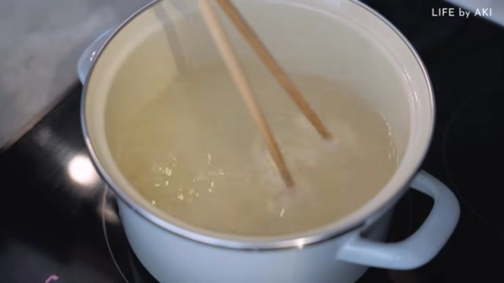 まず沸騰したお湯に平麺を入れ、箸でほぐします。茹で時間はパッケージで確認してみてくださいね。