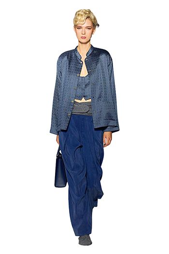 亡きジョルジオ・アルマーニ氏が手がけた最後のコレクションからは、上品なネイビーのジャケットが美しくきらめくルックが登場。ボトムはしっとりとしたテクスチャーで、色の濃淡だけでなく素材の違いもモードな姿を築く要素に。