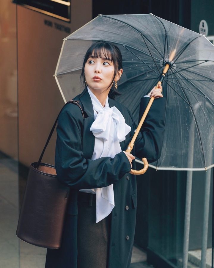 4月24日(金)、雨の日の通勤バッグは、傘を持つ手ももたつかない縦型ショルダーが便利。レザーのように見えるリッチな質感ながら、実はエコフレンドリーな人工皮革だと、天気に左右されず使えるのも魅力で、梅雨前に1つ持っておくと安心なアイテムです。服はバッグに合わせてダークカラーでシックにまとめつつ、白のボウタイブラウスで華やかさをプラスすれば、モノトーンで上品&知的なきれいめ通勤コーデに。