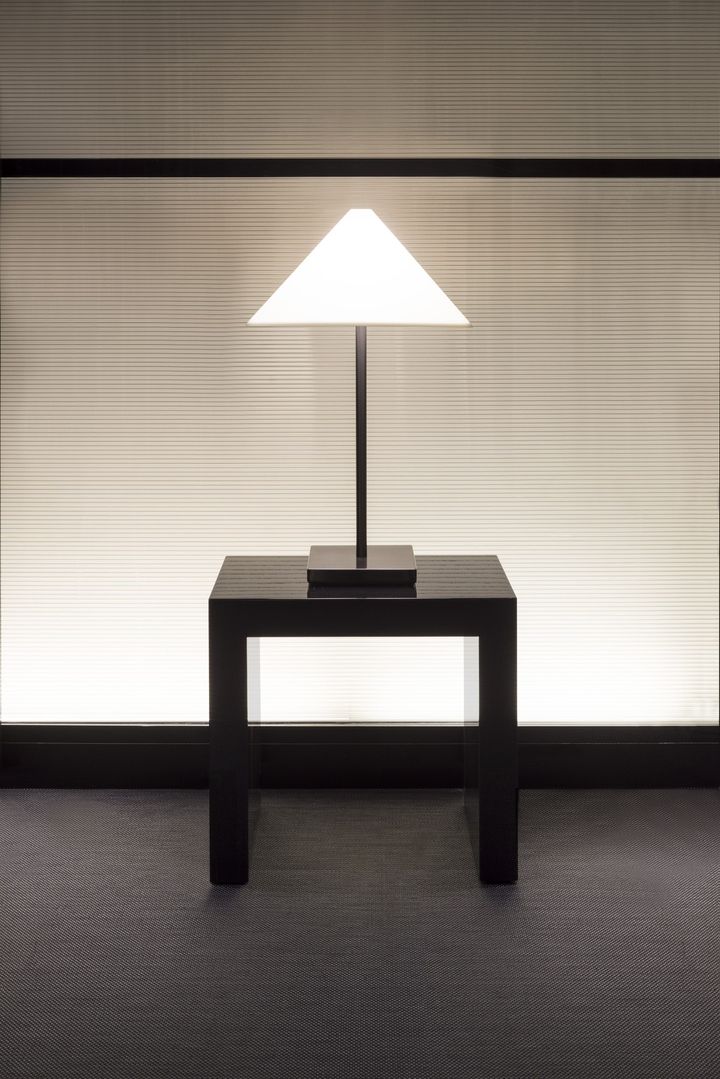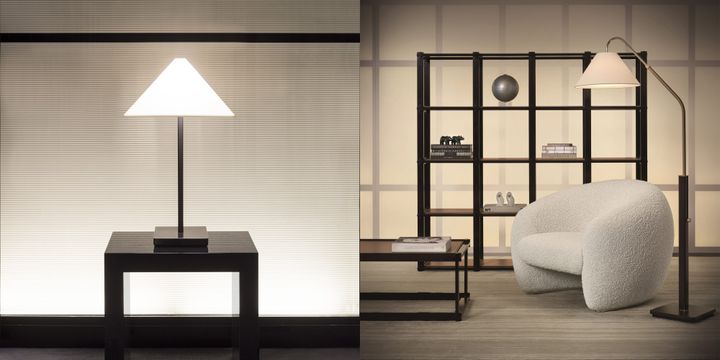 ジョルジオ・アルマーニ自らが1982年に手掛けたテーブルランプ「Logo Lamp(ロゴ ランプ)」が、今回のインスタレーションの主役。デザインスケッチに向き合う手元を優しく照らすために生まれたというこのランプは、光を的確に落としながらも視界を遮らないよう考慮された、独自のフォルムが特徴です。これこそが機能性と美しさを両立させるアルマーニの哲学が凝縮されたデザインであり、アルマーニ/カーザの美学を最も純粋に映し出すアイコンとして、いまなお愛され続けています。