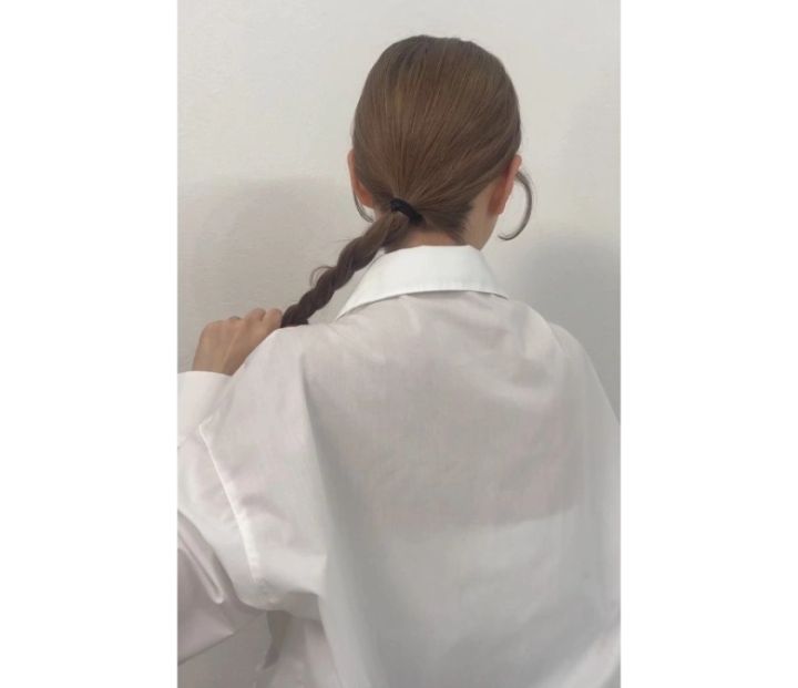 毛先のほうまで三つ編みし終わったら、最後はヘアゴムで結びます。