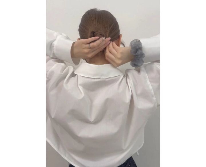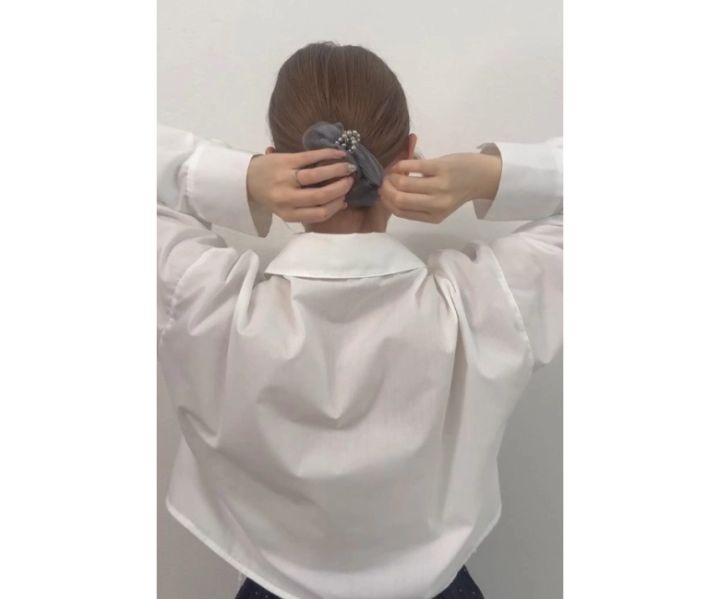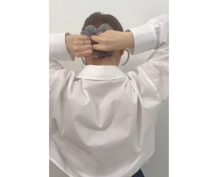 ⑤で毛束を巻きつけて作ったお団子を押さえながら、上からシュシュをかぶせ、結んでいきます。
