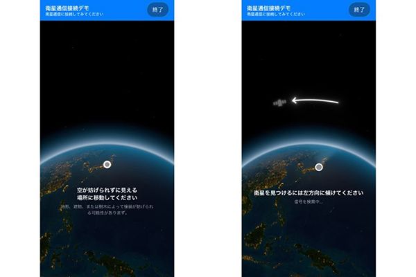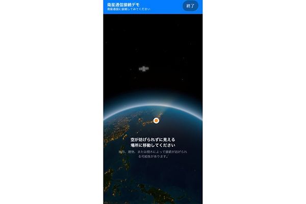 画面の案内に従って進むと、「衛星通信接続をテストする」と表示されるのでタップします。すると、衛星通信接続デモの画面に移ります。