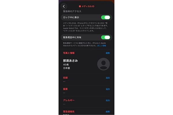 また、iPhoneの「ヘルスケアアプリ」内「メディカルID」で、服薬やアレルギー等の情報や緊急連絡先をあらかじめ入力し、「緊急電話中に共有」をオンにしておくことも重要です。緊急連絡先に家族などの電話番号を登録しておくと、緊急通報サービスへの通報後、キャンセルしない限り登録した連絡先に自動で最新の位置情報などを送信してくれます。