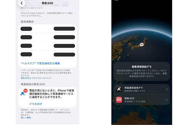 「設定」アプリ>「緊急SOS」>衛星経由の緊急SOS「デモを試す」