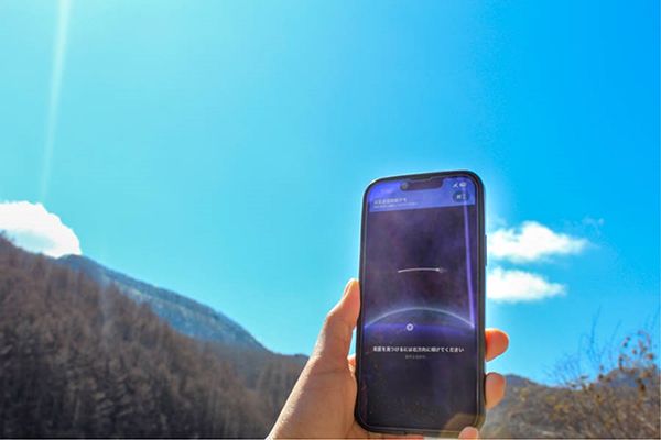 この際、衛星をうまく見つけられないと「空が妨げられずに見える場所に移動してください」と表示されます。