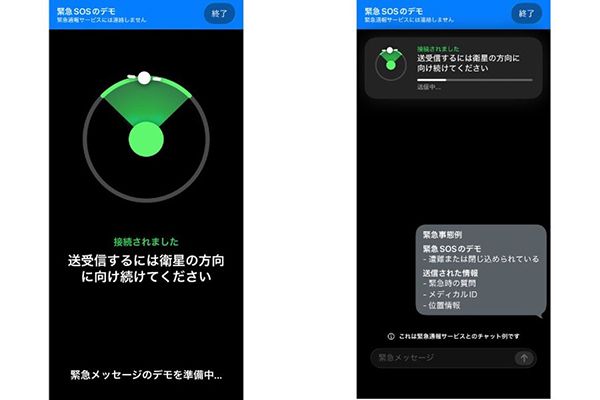衛星接続のデモ画面では、緊急SOSを体験することができます。実際に緊急メッセージを送ってみました。