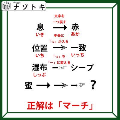 その法則をもとに「みつ」という言葉を変化させて答えを考えましょう。すると「みつ」が「まち」となり、「まち」が「まっち」となり、「まっち」が「まーち」となります。正解は「マーチ(まーち)」でした。