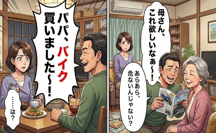 ところが、ある日の夕食時。突然、夫が「発表があります!パパ、バイク買いました~!」と声を張り上げたのです。耳を疑い、すぐに確認すると、義母と内緒でバイク店を巡り、すでに購入していたことが判明しました。