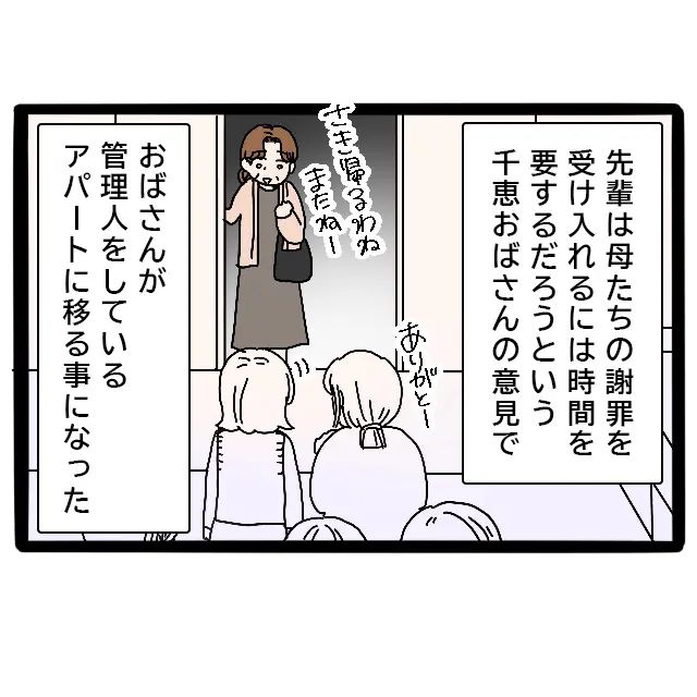 みずほ先輩が母たちの謝罪を受け入れるには時間を要するだろう、という千恵おばさんの意見で、先輩はおばさんが管理しているアパートに移る事になりました。またね、と先に帰るおばさんを、みんなで見送ります。