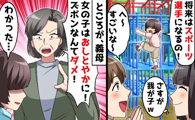 その日も娘は、いつものように公園の遊具で元気に駆け回って遊んでいました。そこにタイミング悪く通りかかった義母。「遊ぶなら、おままごととかお絵かきとか、女の子らしい遊びをしなさい!」と大きな声で注意し始めました。