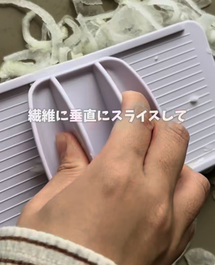 新玉ねぎは、繊維に垂直にスライサーで薄くカットします。