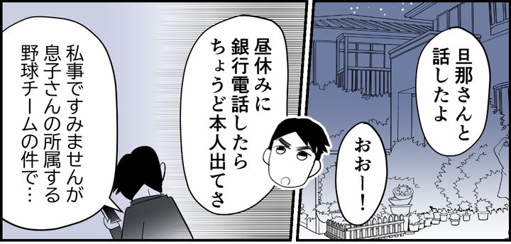 私(エトウカナ、30代)は夫(トモキ、40代)と小4の息子(ダイキ)との3人暮らし。息子の希望でAという野球の強豪チームに入会し、私は親会という親のサポート組織で子どもたちの送迎などを担っていました。しかしレギュラーになれなかった息子は一気に野球への熱が冷め、わずか数か月で退会を決めます。すると代表(アイダ、40代)と副代表(イノウエ、30代)から休会中の差し入れ費用として5万円を要求されたのです。私が夫に相談すると、男同士で話したほうがいいと判断した夫は、副代表の旦那さんと話してみると言います。
