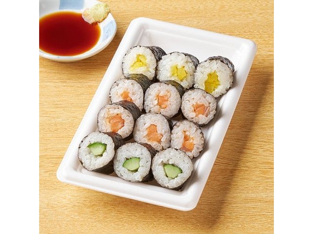 サーモン巻など3種類の巻寿司が楽しめる、一口サイズのお寿司セットです。