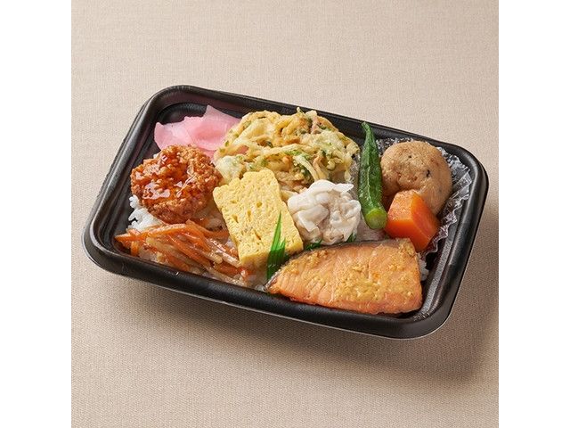 銀鮭の西京焼きをメインに、煮物、厚焼き玉子、かき揚げ、シュウマイなど8種類の人気のおかずを盛り付けたお弁当です。