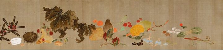 一方、《菜蟲譜(さいちゅうふ)》は、《果蔬図巻》の1年後に描かれた長さ11mに及ぶ大作で、前半部分に野菜や果物、後半部分に昆虫、蝶、爬虫類などの数々の生き物が描かれており、国の重要文化財に指定されている。