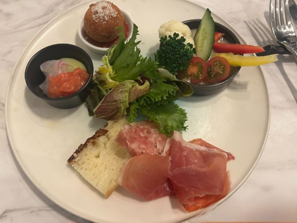 前菜盛り合わせは、数種類の葉物の周りにライスコロッケ、バーニャカウダ、フォカッチャと生ハムを添え、カルパッチョは珍しいスタイルで。 西洋ネギとされるリーキに白身魚のハタを重ね、高知産のトマトと日本酒を合わせたソースをたっぷりとかけたオリジナルです。 おすすめの軽めの赤ワインとのペアリングで、一段と至福感の高まる一皿です。