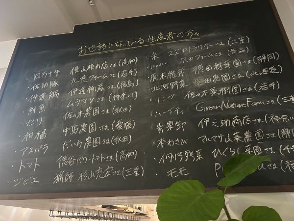 店内の黒板には、その日に使われる食材と、それぞれの産地や生産者の名前が丁寧に書かれています。 県名だけでなく農園まで記されており、素材の背景がひと目で伝わってくるのが印象的です。 実はシェフ自ら農家を訪ねて仕入れをしているんだとか。