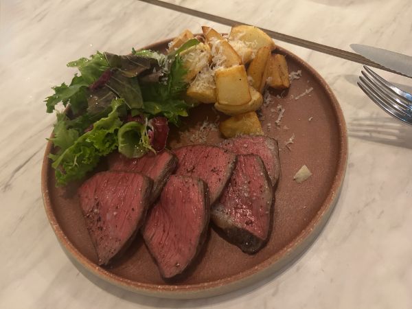 メインは高知県産・四万十牛のロースト。美しい赤身に絶妙な火入れで仕上げられ、旨みがしっかりと閉じ込められています。 添えられたポテトも秀逸。さっと揚げたほくほくのじゃがいもに削ったパルミジャーノチーズがコクを加え、お肉の美味しさを引き立てる名脇役です。 しっかりとした赤ワインと合わせて、ゆっくりと楽しみたくなりました。