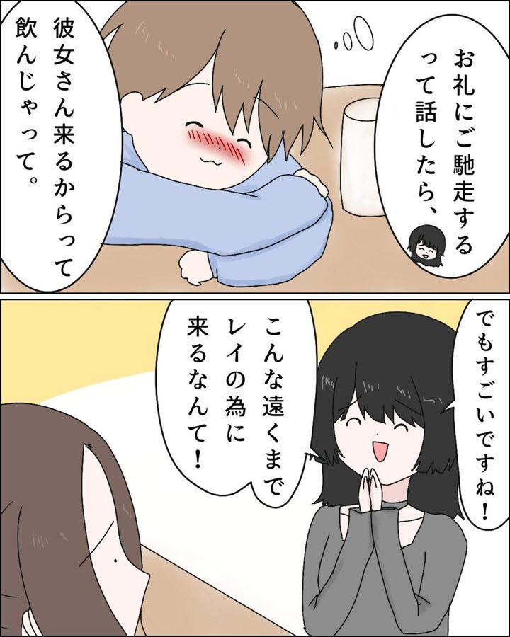 「お礼にご馳走するって話したら、彼女さん来るからって飲んじゃって」彼女はそう説明すると、私の方に視線を移し「でもすごいですね!こんな遠くまでレイのために来るなんて!」と感心したように言いました。