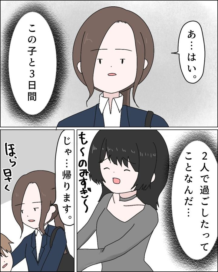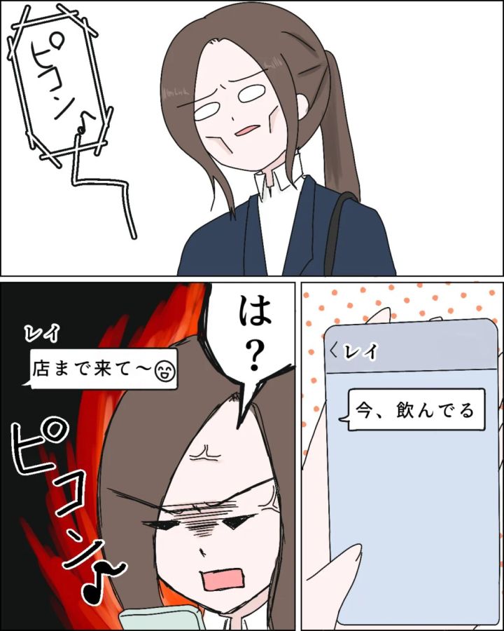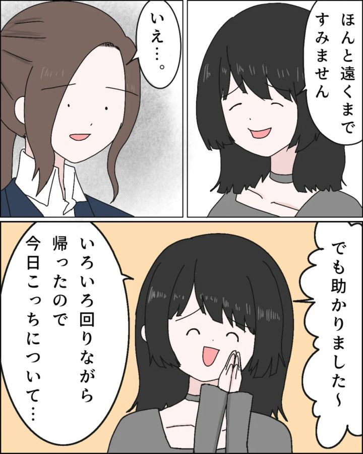 「ほんと遠くまですみません」レイの友達らしき女性にそう声をかけられ、私は複雑な気持ちを隠しきれないまま「いえ・・・」と返します。友達って女の人だったんだ。すると彼女は悪びれる様子もなく「でも助かりました~いろいろ回りながら帰ったので、今日こっちについて・・・」と笑顔で言いました。